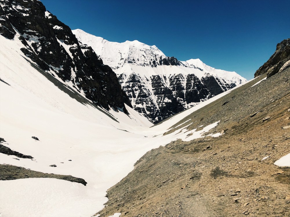 Cesta zacina pozvolnym stoupanim, ktere prechazi v nemilosrdny krpal. Nohy ujizdi po suti, drapeme se v podstate kolmo nahoru, lezeme pres pulmetrove skalni schody. Takto to pokracuje 500 vyskovych metru. Vysku nabirame rychle a stejne rychle ubyvaji sily. 3.900, 4.100, 4.300 … priblizne v 4.400 metrech se objevuji prvni snehova pole, ktera prechazime a s kazdym dalsim metrem snehu pribyva. Cca do 4.600 m.n.m. jsou videt stopy nekoho, kdo se pokusil jit pred nami, pak ale stopy mizi a my slapeme po panenskem snehu.