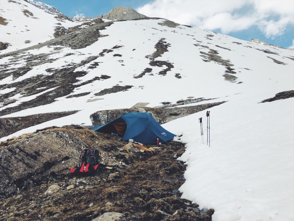 Nas pruvodce nema stan a rozhodl se s nami zustat. Postavil si nekde ve skalni sterbine s pomoci kamenu misto na prespani, nechapeme, jak to muze prezit. Nabizime mu, ze kdyz bude zle at za nama prijde do stanu. Sice se tam nevejdeme, ale nejak prezijeme …