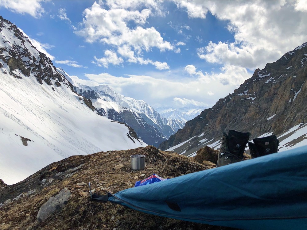 Pocasi je krasne a nas ceka nejtezsi cast vystupu na Baga La … nejprve priblizeni – asi hodina svizne chuze a trocha stoupani, potom vysvih na 500 m vysoky utes a pote dalsi stoupani zasnezenym zlebem do high campu. Tam prespime ve stanu a pokusime se o letosni prvovystup do sedla Baga La. Jeste nikdo sedlo letos nevysel … tak batohy na zada a s osmou rano vyrazime.