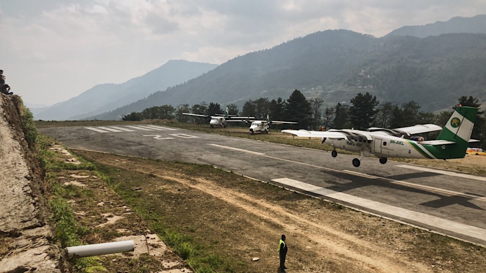 Prulet sedlem do udoli kde se nachazi Lukla je majstrstyk. Po stranach vidim 100m a nad zemi mame rezervu cca 120m. Zacinam mit pochopeni pro cekani na bezvetrne pocasi.