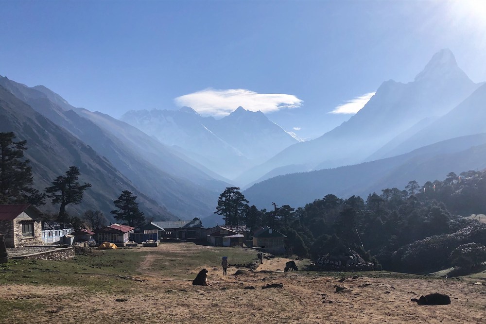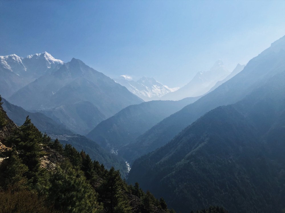 Vyrazime po pul osme, stoupame Namche Bazarem a po asi 250 metrech vylezame na hreben, kde se nam otevira krasny vyhled do celeho udoli Khumbu.