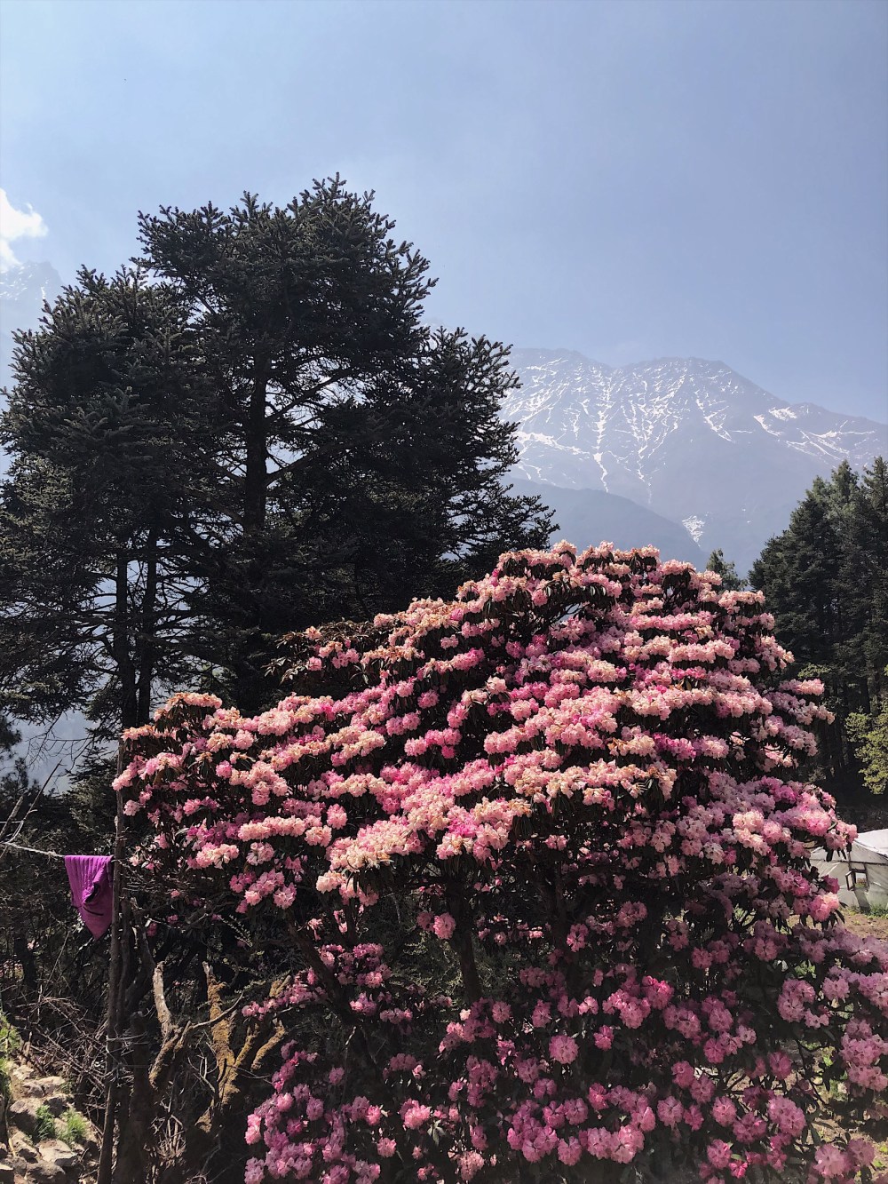 Kolem nas se zacinaji cim dal vice objevovat kvetouci rododendrony, na pozadi s bilymi horami vytvareji krasne scenerie.
