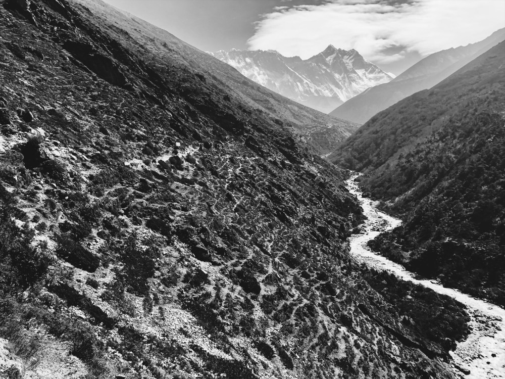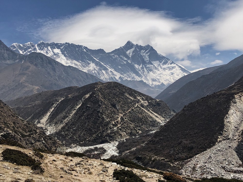 Ve chvili, kdy se blizime k cili nasi dnesni cesty, ukazuje se v plne krase prvni 8ka na nasi ceste. Lhotse (8516m), ctvrta nejvyssi hora sveta a jeji vedlejsi vrchol Lhotse Shar (8393m). Uzasna, majestatni hora si krom brzkeho rana drzi u vrcholku neustale vlastni oblacnost a s ubyvajicim dnem se do ni zahali temer cela jako do hebkeho bileho prosteradla.