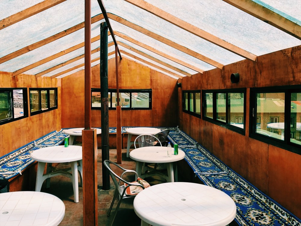 Vybirame si hotel a jsme prijemne prekvapeni necim, co vedouci hotelu nazyva slunecna terasa. Je to defakto sklenik v hornim patre a je tam pekelne teplo a krasne vyhledy na vsechny strany. Teplo je ale super, susime co se da, vcetne sebe.