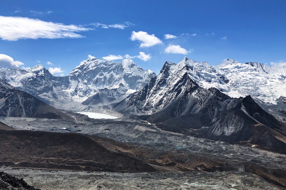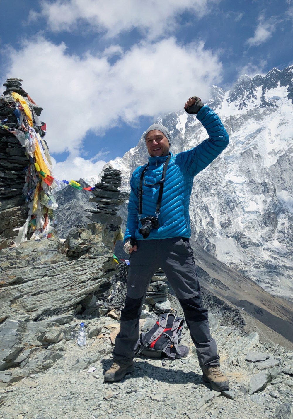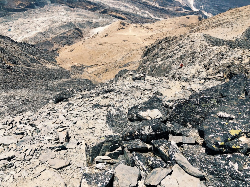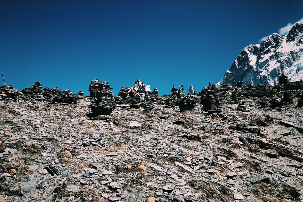 Jsem tam drive, tak si sebevedome vyslapnu na homoli. Nahore zjistuji, ze je to tam sice pekne vyzdobene praporky a kamenymi mohylkami, ale ma to vysku jen 5300m a mapa ted jasne ukazuje, ze vrchol Chukung Ri, je ta vysoka zvetralina naproti.