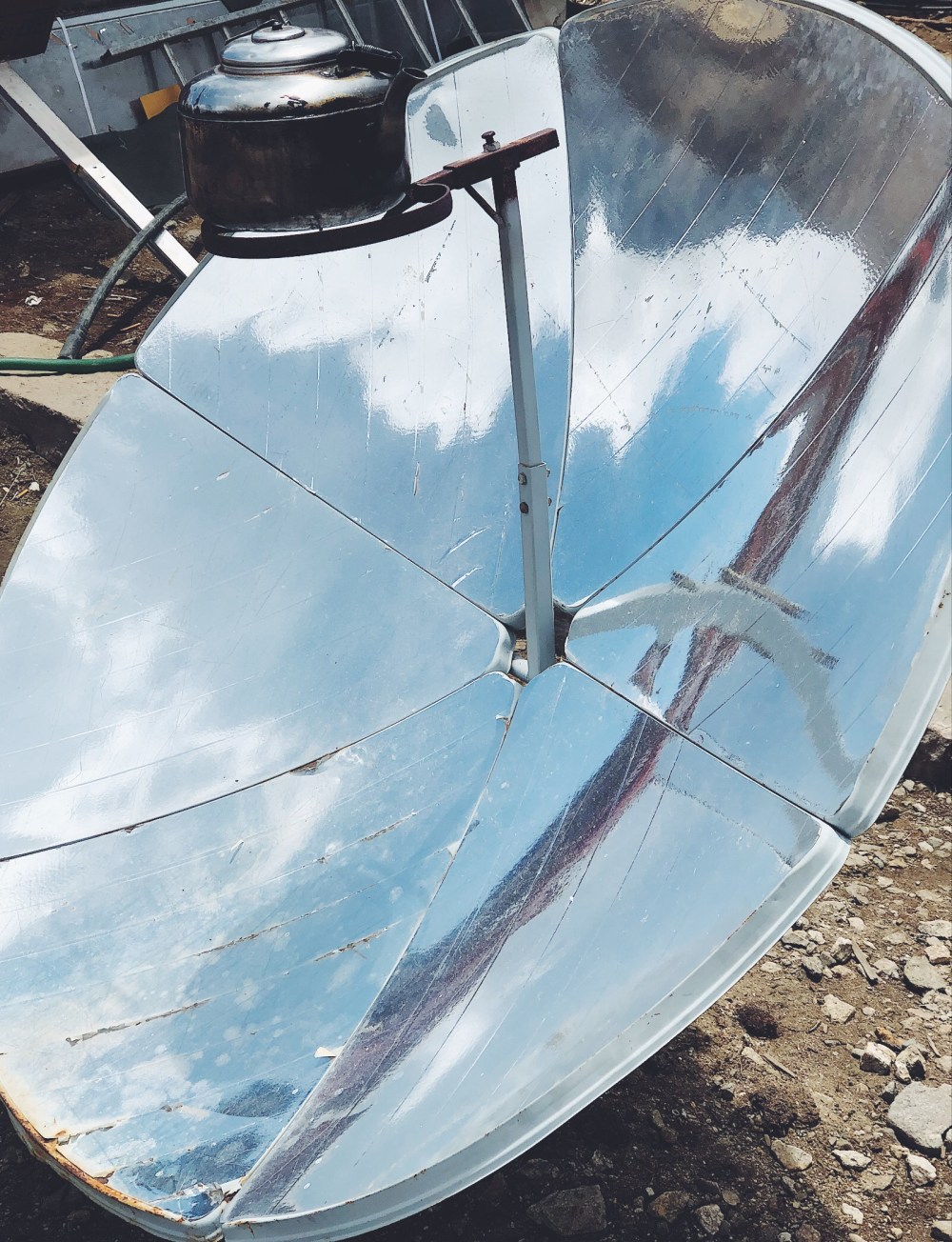 Uz 6 dni mi vrtaji hlavou stribrne talire, ala satelit, ktere zdobi zahradky temer kazdeho domku. Tusime ramcove o co jde, ale ptame se na detaily. Jedna se o velmi ucinny solarni varic. Bez problemu se v nem da uvarit voda, ale trebas i rovnou ryze nebo cele jidlo.