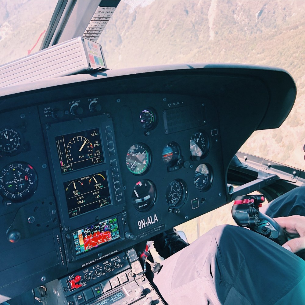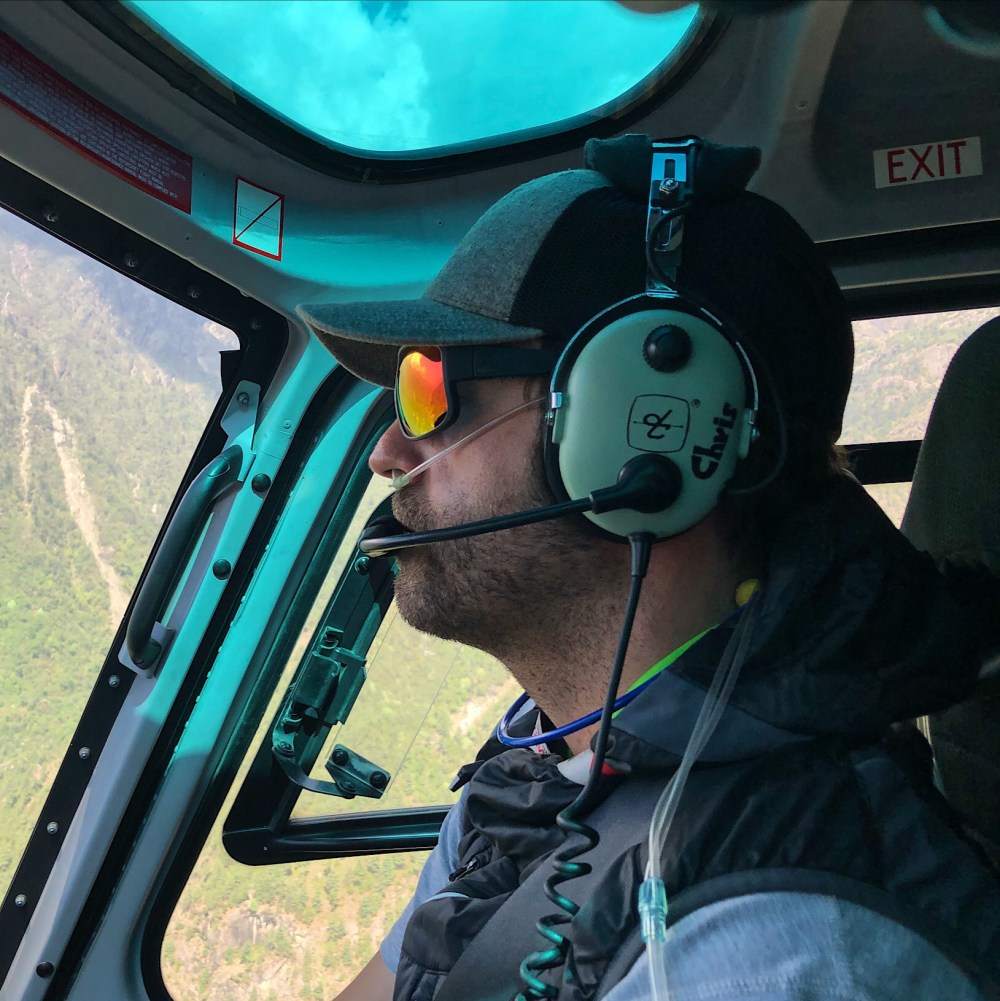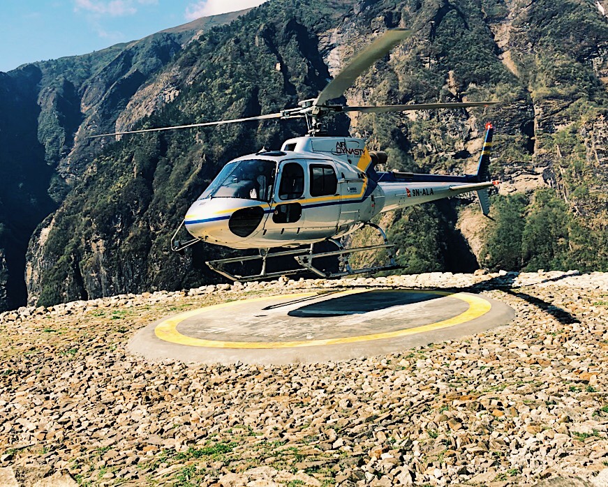 Konecne priletava nase helikoptera … pristava, behem minuty je vylozeny naklad, druhou minutu mame na nasednuti a ve treti minute je uz pod nami kilometrova propast a my letime. Neletime 3, ale nakonec je nas 6 … jo jo, takhle se tu vydelava.