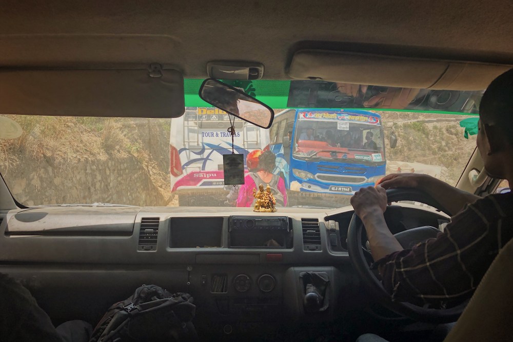 Cesta nepalskym vnitrozemim je docela zazitek, nas ridic ma dusi zavodnika a vsechny predjizdi i kdyz malokdy vidi za zatacku, cesta se neustale vlni, stoupa a klesa.
